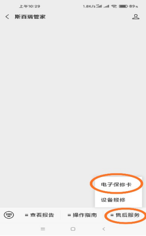 1. 先打開手機(jī)微信,添加公眾號"斯百瑞管家“,點(diǎn)擊關(guān)注。點(diǎn)擊菜單”售后服務(wù)“----電子保修卡;(圖一)
